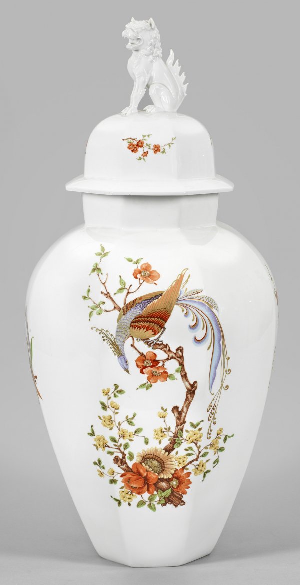 Monumentale Zierdeckelvase mit asiatischem Dekor Balusterförmiger Korpus mit facettierter Wandung. Korrespondierender Deckel mit plastisch gestaltetem Foo-Hund. Farbenprächtiger Dekor, sog. "Olivia" in der Art ostasiatischer Dekore. Auf der Wandung großzügig angelegte Darstellung eines auf einem Blütenast sitzenden Phönix in feiner, polychromer, goldgehöhter Malerei. Manufakturmarke. H. 85 cm.