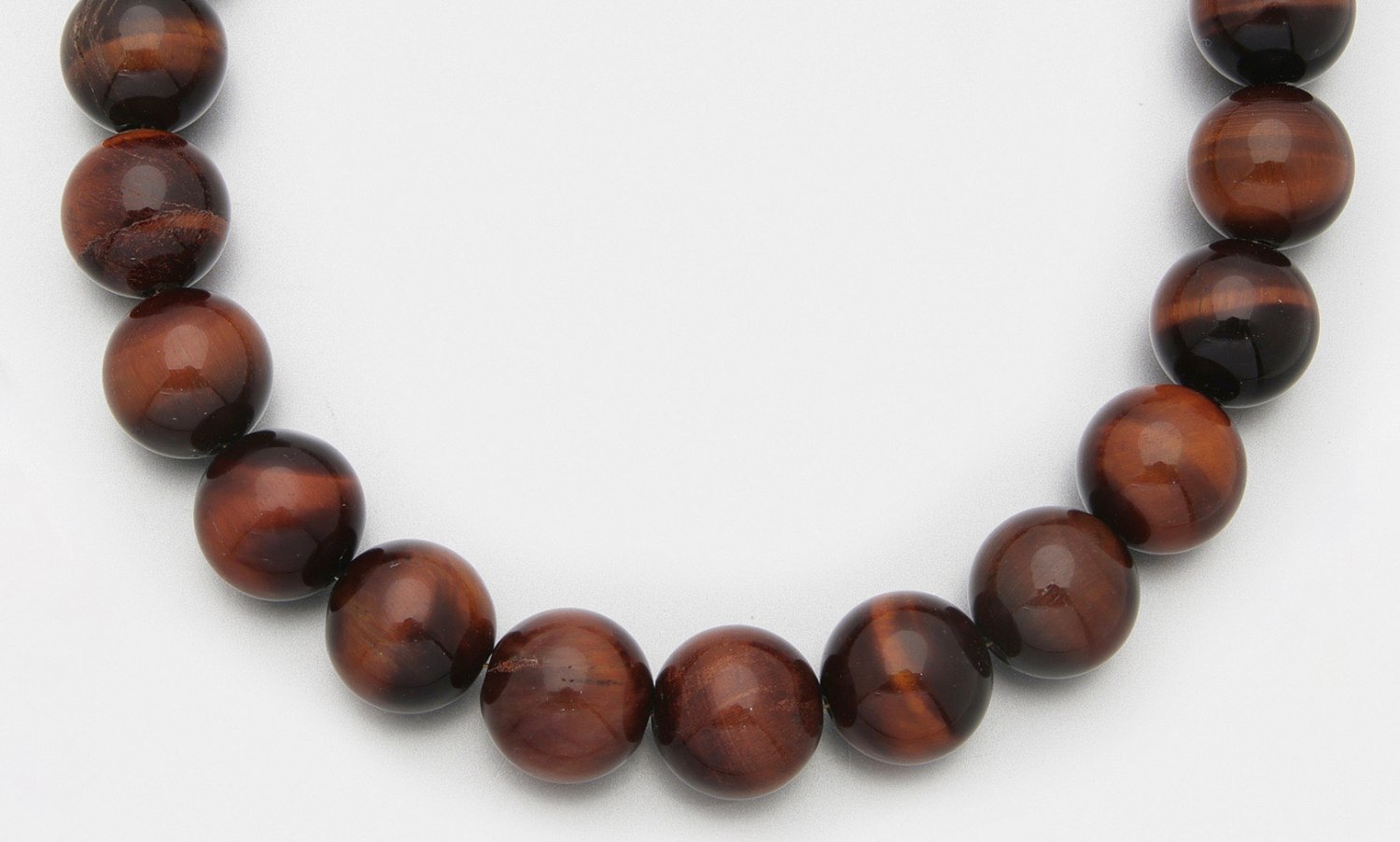Tigeraugen-Collier Gelbgold gest. 750. Einreihige Kette aus insges. 25 großen zweifarbigen braunen Perlen von ca. 16 mm mit sog. Katzenaugen-Effekt. Große Federringschließe. Gew. ca. 136 93 g.