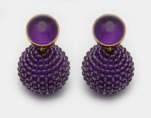 Paar extravagante Amethyst-Ohrgehänge von Birgit Weingarten Roségold gest. 750. Besetzt mit zwei tief violettfarbenen Amethystcabochons von jeweils ca. 13 mm unterhalb jeweils eine Kugel flächendeckend umzogen von korrespondierenden kleinen Amethystperlen. Herstellerzeichen. Original Etui. Ges.-Gew. ca. 3 29 g.