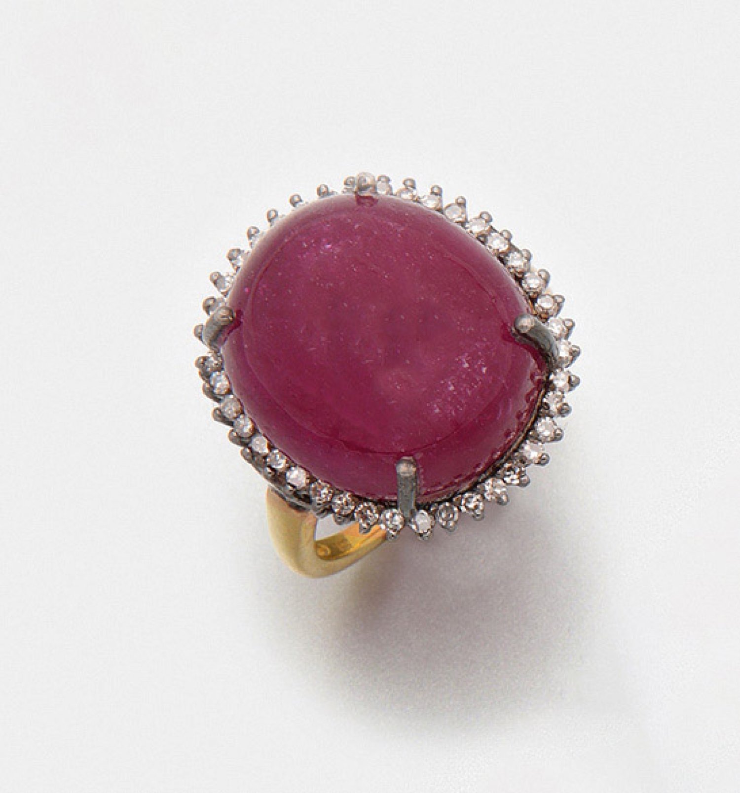 Klassischer Rubinring Gelbgold, gest. 14 ct.; Zentral besetzt mit einem taubenblutroten Rubincabochon von ca. 35 ct., entouriert von Diamanten von zus. ca. 0,35 ct., Gew. ca.11,30 g.