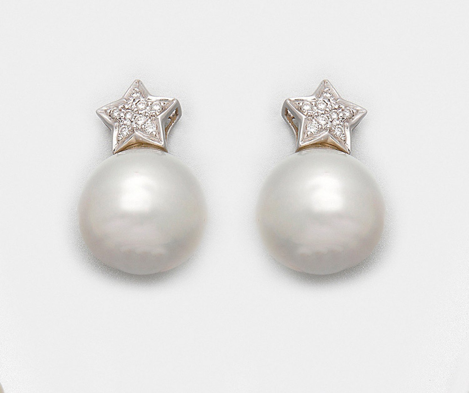 Paar Südseeperl-Ohrringe mit Diamantsternen Weißgold gest. 750. Steckbrisur besetzt mit Diamanten von zus. ca. 0 20 ct. unterhalb jeweils eine weiße Südsee-Zuchtperle von ca. 15 mm in sehr farbintensivem rosé-grün changierendem Lüster. Ges.-Gew. ca. 12 62 g.