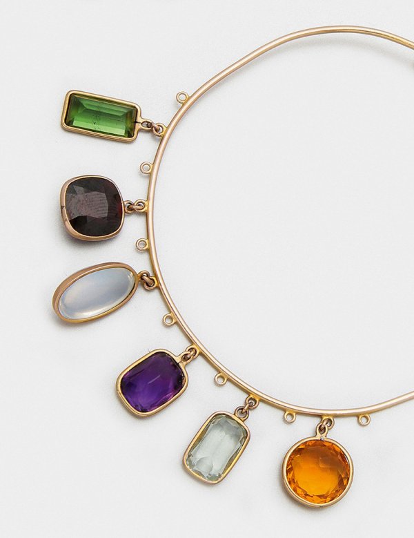 A bracelet by GWB set with tourmalines peridot citrine and moonstone in 14 k red gold. Manufacturer's mark.