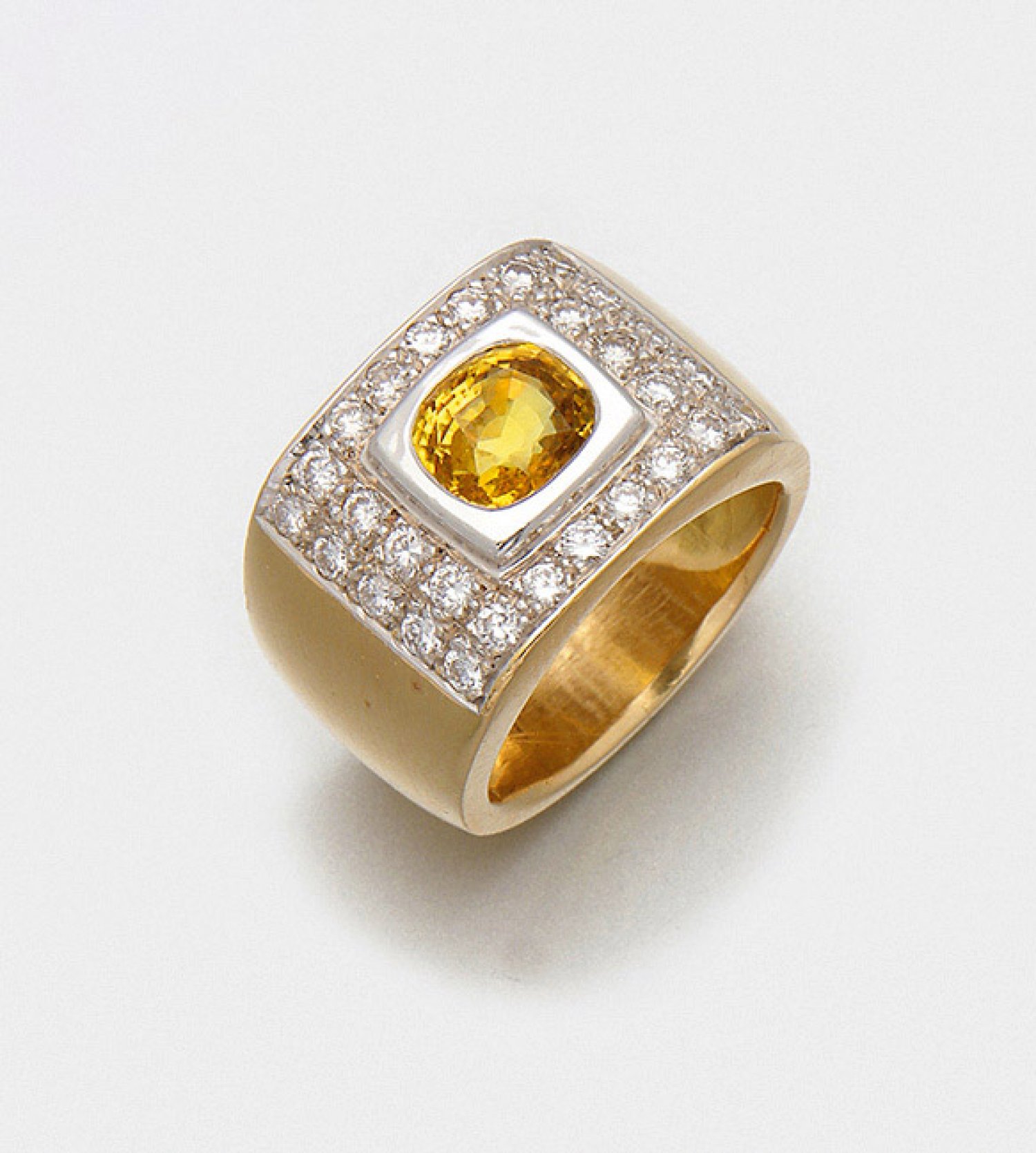 Repräsentativer Bandring mit Saphir-Brillanten Gelbgold, 18 ct.; Zentral besetzt mit einem lemonfarbenem Saphir von ca. 2,00 ct., entouriert von Brillanten von zus. ca. 1,30 ct.; Gew. ca. 18,85 g.