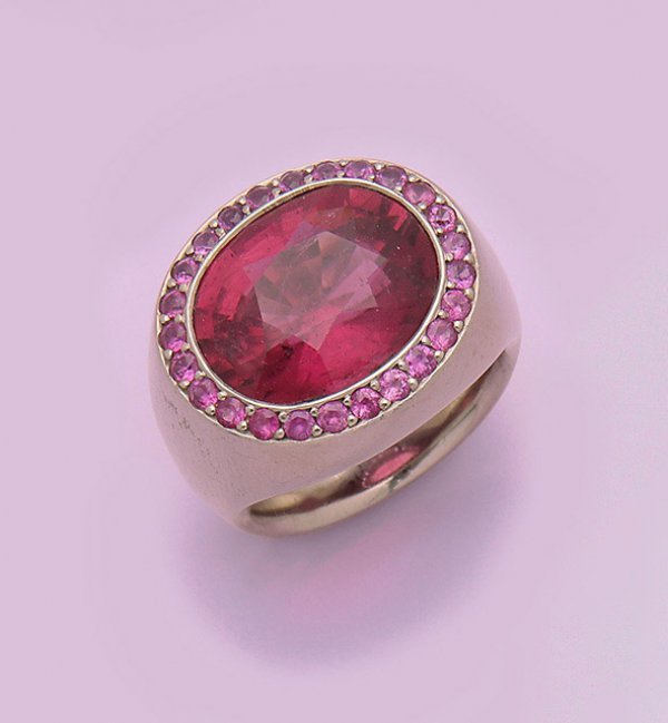 Repräsentativer Turmalinring Weißgold, gest. 750. Zentral besetzt mit einem pinkfarbenem Turmalin von ca. 11 ct., entouriert von korrespondierenden pinkfarbenen Saphiren von zus. ca. 0,84 ct.; Sehr schöne Goldschmiedeausführung. Herstellerzeichen CCS.