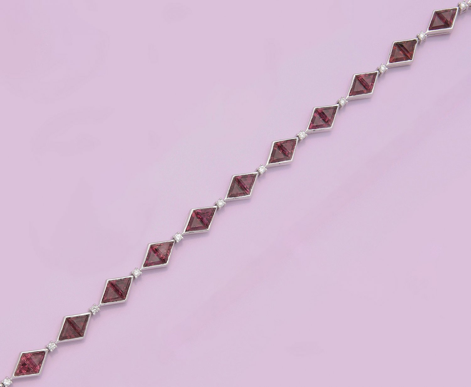 Elegantes Rubellit-Armband Weißgold, gest. 750. Linear besetzt mit rot-violetten Rubelliten von zus.ca. 11 ct., in rautenförmiger Fassung, unterteilt durch Brillanten von zus. ca. 0,40 ct.; Gew. ca. 13,98 g.