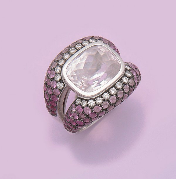 Mondäner Kunzitring von Juwelier Mahlberg Weißgold gest. 750. Zentral besetzt mit einem hellrosafarbenem Kunzit von ca. 9 01 ct. und Diamanten von zus. ca. 0 48 ct. (H/vsi) sowie pinkfarbenen Saphiren von zus. ca. 1 84 ct. in Pavéfassung. Gew. ca. 16 54 g.
