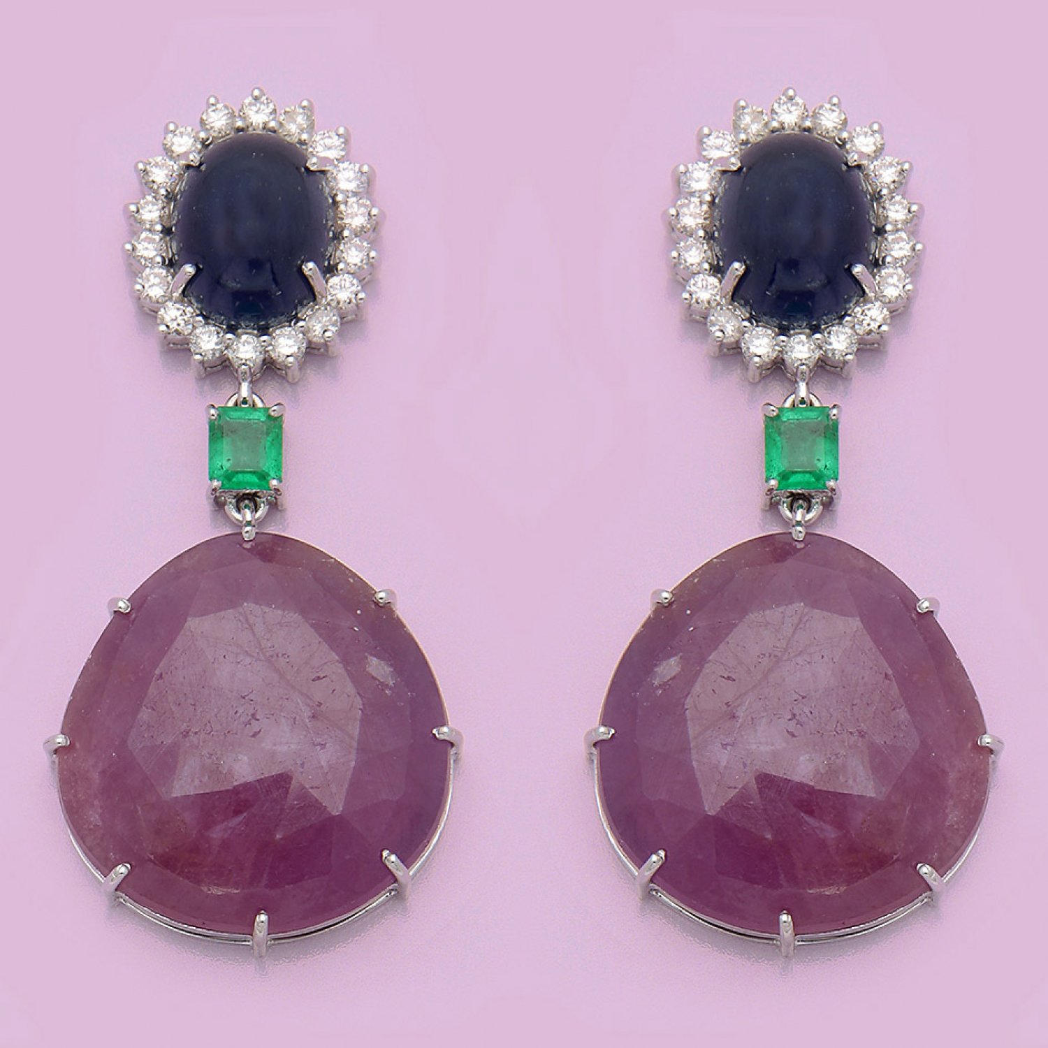Paar repräsentative Multicolor-Ohrringe Weißgold, gest. 750. Schauseitig besetzt mit nahezu kornblumenblauen Saphircabochons von zus. ca. 10,84 ct., entouriert von Brillanten von zus. ca. 1,10 ct. sowie Smaragden von zus. ca. 0,73 ct., abschließend zwei Rubine von zus. ca. 42 ct.; Ges.-Gew. ca. 20,28 g.