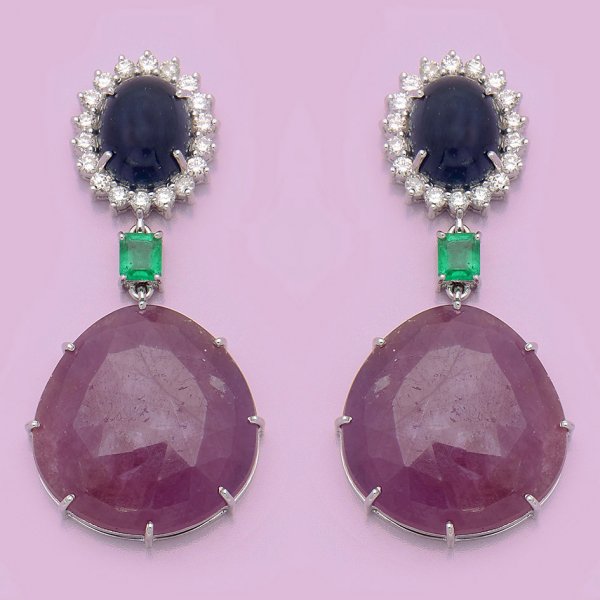 A pair of earrings set with nearly cornflower blue sapphires approx. 10,84 ct., diamonds approx. 1,10 ct., emeralds approx. 0,73 ct. and two rubies approx. 42 ct., in 18 k white gold.