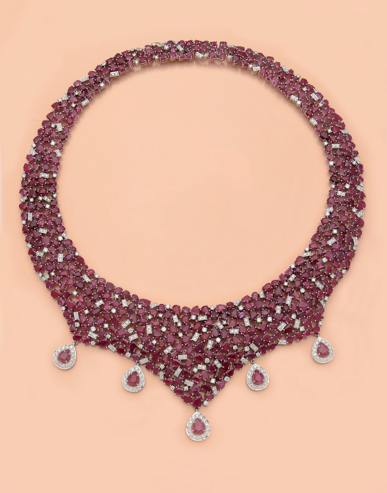 Prachtvolles Rubin-Collier im traditionellen Juwelenstil Weißgold, gest. 750. Schauseitig ausgefasst mit taubenblutroten Rubinen von zus. 133 ct. im Tropfenschliff, akzentuiert durch Diamanten von zus. ca. 7,60 ct.; Gew. ca. 147,06 g.
