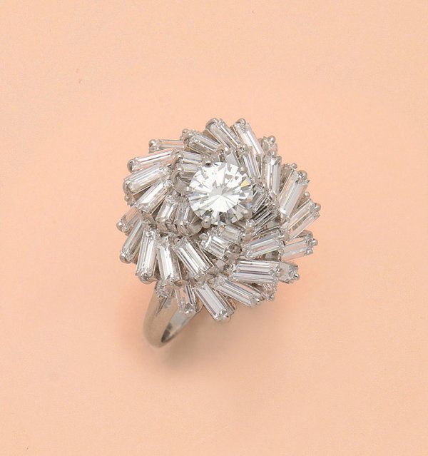 Glamouröser Diamant-Cocktailring Platin gest. 950. Zentral besetzt mit einem Brillanten von ca. 1 10 ct. (G-H/vvs-vs) entouriert von insges. 40 Diamantbaguetten von zus. ca. 3 50 ct. (G-H/vvs-vs). Gew. ca. 17 33 g.