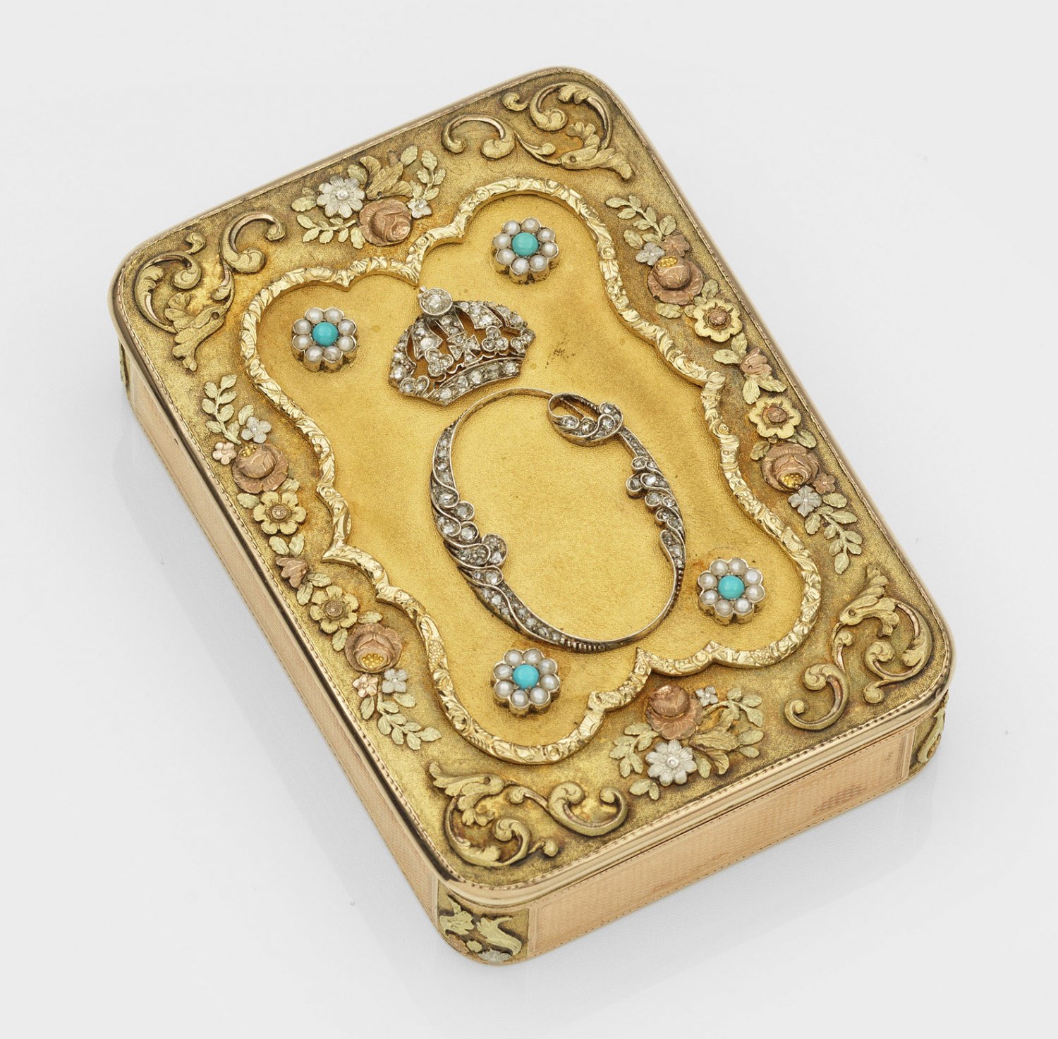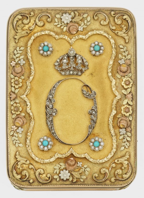 750er Gelb-, Rotgold und Platin, besetzt mit Brillanten, Türkisen und Perlen. Rechteckig mit gerundeten Ecken, leicht überstehender Scharnierdeckel. Mit Wellenbändern und Netzstrukturen reich guillochierter Boden und Wandung. Die Ecken mit applizierten, ziselierten Akanthusblatt- und Blütenmotiven verziert. Geometrisch gegliederter Deckel mit rahmendem, trikolorem Ranken- und Blütenbesatz, eine mittige, passige, kleinteilig punzierte Kartusche aussparend und umgeben von perlumrandeten Türkisen. Zentral aus holländischen Rosenbrillanten gebildetes, appliziertes und bekröntes "O" für Otto, König von Griechenland. Grünes, goldgeprägtes Originaletui mit Inventar-Nr. 27, besch.; Gest., Beschauzeichen, Meistermarke "IB"; Gew. ca. 132 g. H. 2 cm. 8,7 cm x 6,3 cm.