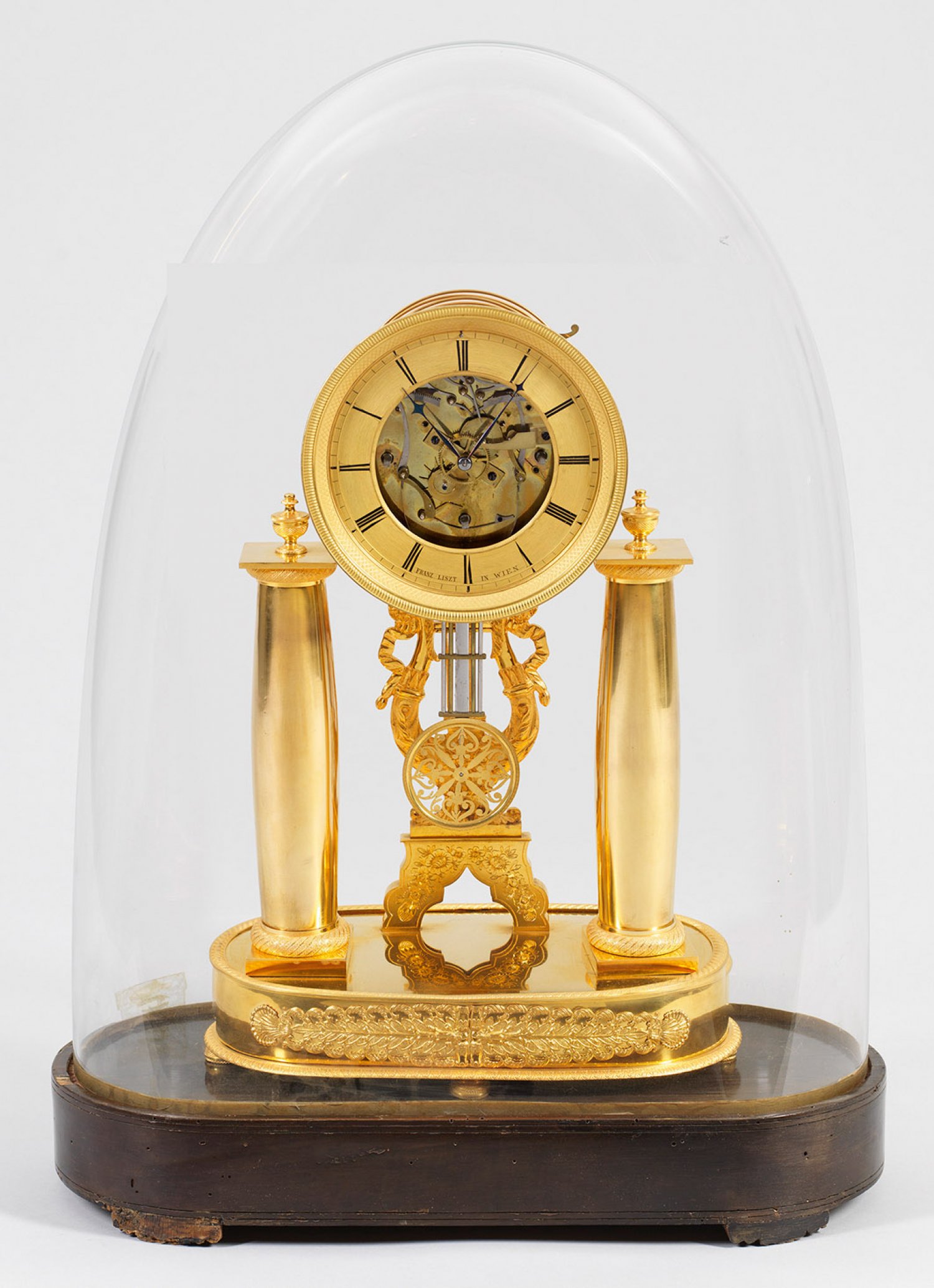 Feine Wiener Biedermeier-Uhr Messing vergoldet. Architektonisch gegliedertes Uhrengehäuse aus kräftigen Vollsäulen mit kleinen Vasenbekrönungen und lyraförmiger Stütze als Träger für sichtbares Uhrwerk mit fein profiliertem Ziffernring bez. Franz Liszt in Wien. Mechanisches Werk mit Fadenaufhängung Rechenschlagwerk sowie sog. Wiener-Viertelstundenschlag auf zwei Tonfedern. Schlagabsteller. Unterhalb profilgerahmter Ovalsockel mit gestreckten Palmettenmotiven. Dazu großer Glassturz mit Holzsockel. Uhren-H. 46 5 cm. 32 cm x 17 5 cm.