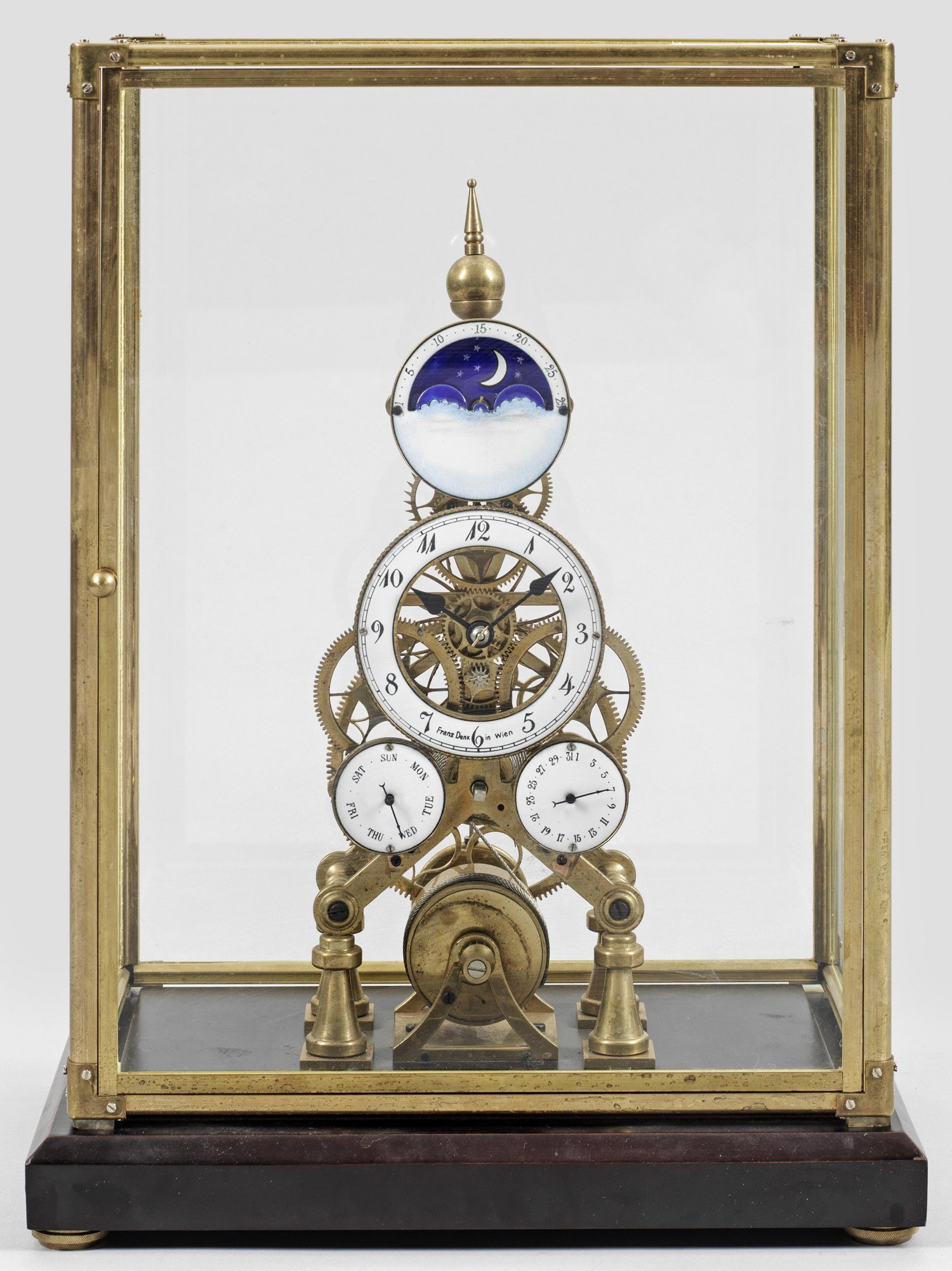 Messing. Offen gestalteter Korpus mit sichtbarem Räderwerk, Pendelfeder sowie Ankerhemmung. Emailziffernring bez. "Franz Denk in Wien". Korrespondierende Mondphase, Datumsanzeige und Wochentage. Ebonisierter Sockel und Glaskasten. Ges.-H. 44,5 cm. 33,5 cm x 23,5 cm.