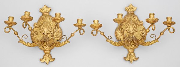 Paar Biedermeier-Wandappliken 4-flg.; Holz, geschnitzt, gefasst und vergoldet. Kartuschenförmiges Wandschild mit erhaben reliefiertem Blattwerk. Davon ausgehend stark geschwungene Leuchterarme aus Metall mit vasenförmigen Tüllen. Unw. besch.; H. 39 cm.