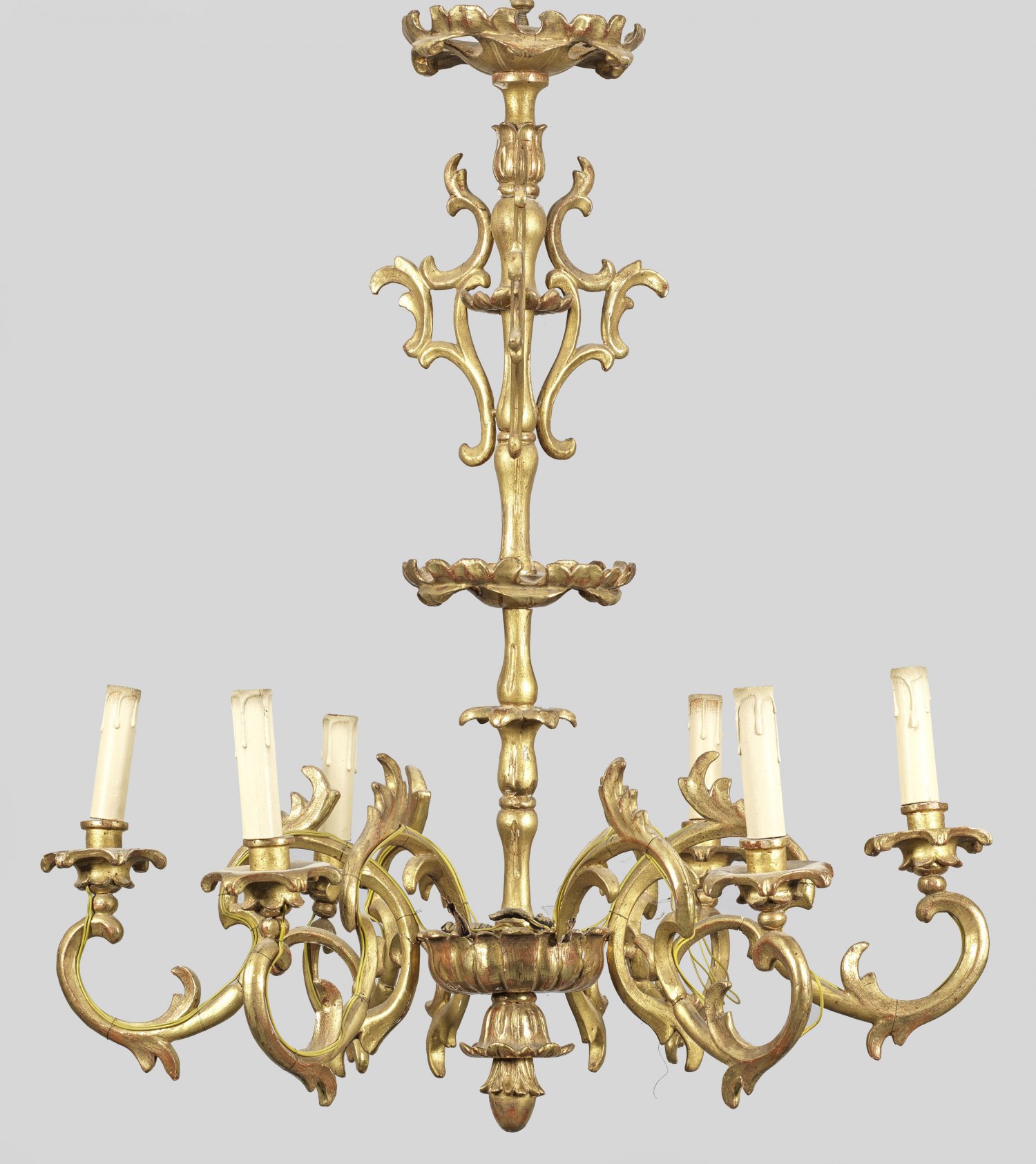 Biedermeier-Deckenleuchter 6-flg.; Holz, geschnitzt, gefasst und vergoldet. Schlanker, mehrfach gegliederter Balusterschaft, gegliedert von durchbrochen gearbeiteten Schalenelementen. Unterhalb davon ausgehend stark geschwungene Leuchterarme aus üppigen Voluten mit zylinderförmigen Tüllen. Elektrifiziert. Ein Arm restauriert. H. 84 cm. D. 73 cm.