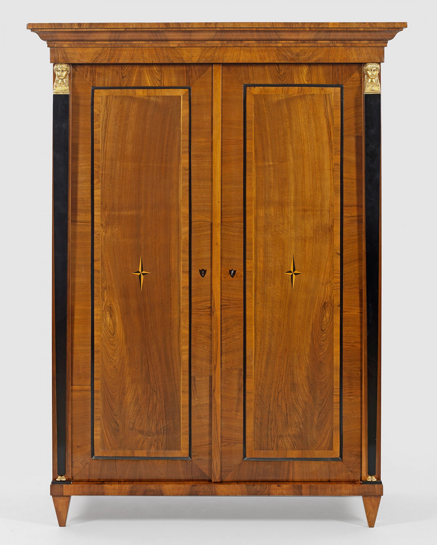 Empire-Kleiderschrank Nussbaum furniert und teilw. ebonisiert und vergoldet. Gerader hochrechteckiger Korpus auf flacher Zarge und konischen Füßen. In der gegliederten Front zwei Türen flankiert von eingestellten weiblichen Karyatiden. Umlaufend vorkragendes Profilgesims. H. 191 cm. 142 cm x 62 cm.