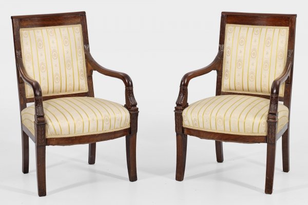 Paar Charles X-Armlehnsessel Mahagoni massiv und furniert. Trapezförmige teilw. bombierte Zarge auf leicht ausgestellten konischen Vierkantbeinen. Reliefplastisch gestaltete Delphine in geschwungene Armlehnen übergehend. Rechteckige Rückenlehnenrahmung mit breitem oberen Abschluss. Gepolstert und bezogen. H. 92 cm. 62 cm x 53 cm. Sitz-H. 44 cm.