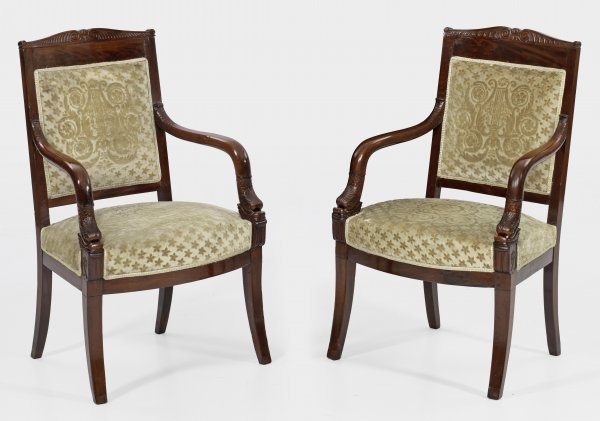 Paar Biedermeier-Armlehnsessel Mahagoni massiv und furniert. Trapezförmige teilw. bombierte Zarge auf leicht ausgestellten konischen Vierkantbeinen. Reliefplastisch gestaltete Delphine in geschwungene Armlehnen übergehend. Rechteckige Rückenlehnenrahmung mit geschweiftem oberen Abschluss aus gegeneinander gestellten Voluten. Gepolstert und bezogen. H. 93 cm. 58 cm x 47 cm. Sitz-H. 45 cm.