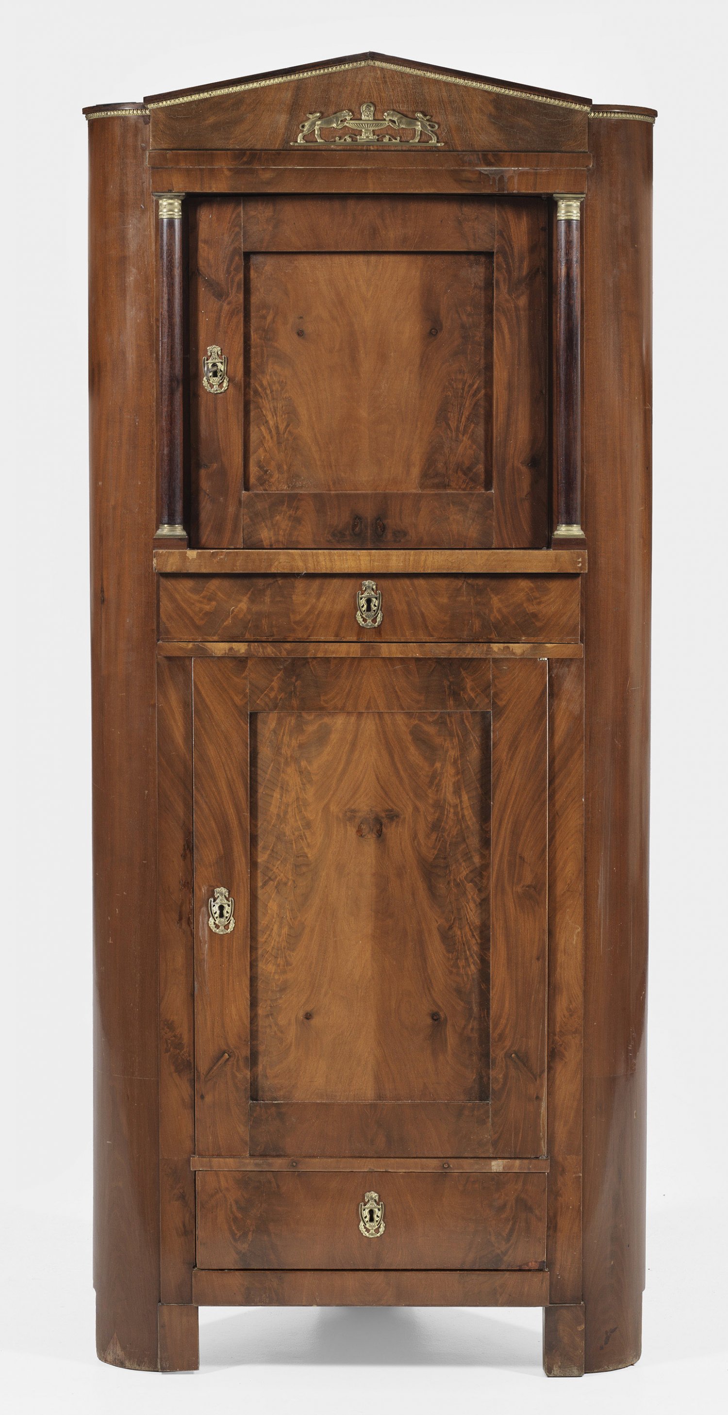 Biedermeier-Eckschrank Mahagoni, furniert. Hochrechteckiger Korpus mit gerundeten Ecken in entsprechende Füße übergehend. In der gegliederten Front zwei teilw. von Säulen flankierte Türen sowie zwei Schubfächer unterschiedlicher Größe. Giebelförmiger oberer Abschluss sowie Applikationen aus Bronze. Teilw. Erg.; H. 203 cm. Schenkel-T. 61 cm.