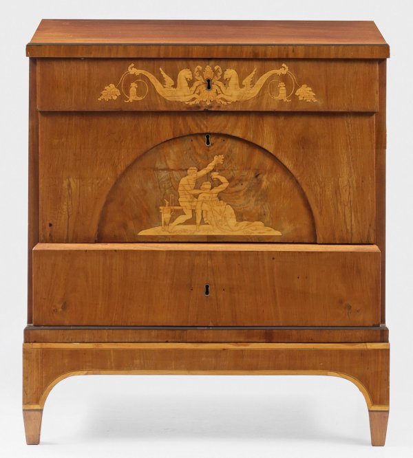 Kleine Empire-Kommode Mahagoni furniert sowie Einlagen aus Ahorn. Gerader rechteckiger Korpus auf leicht vorkragendem segmentähnlich ausgespartem Zargensockel und konischen Füßen. In der gegliederten Front drei Schubladen unterschiedlicher Größe sowie Segmentbogen mit figürlichen Einlagen eines Bacchantenpaares. Oberhalb gegeneinander gestellte Chimären. Gering überstehende Deckplatte. H. 81 5 cm. 74 cm x 47 cm.