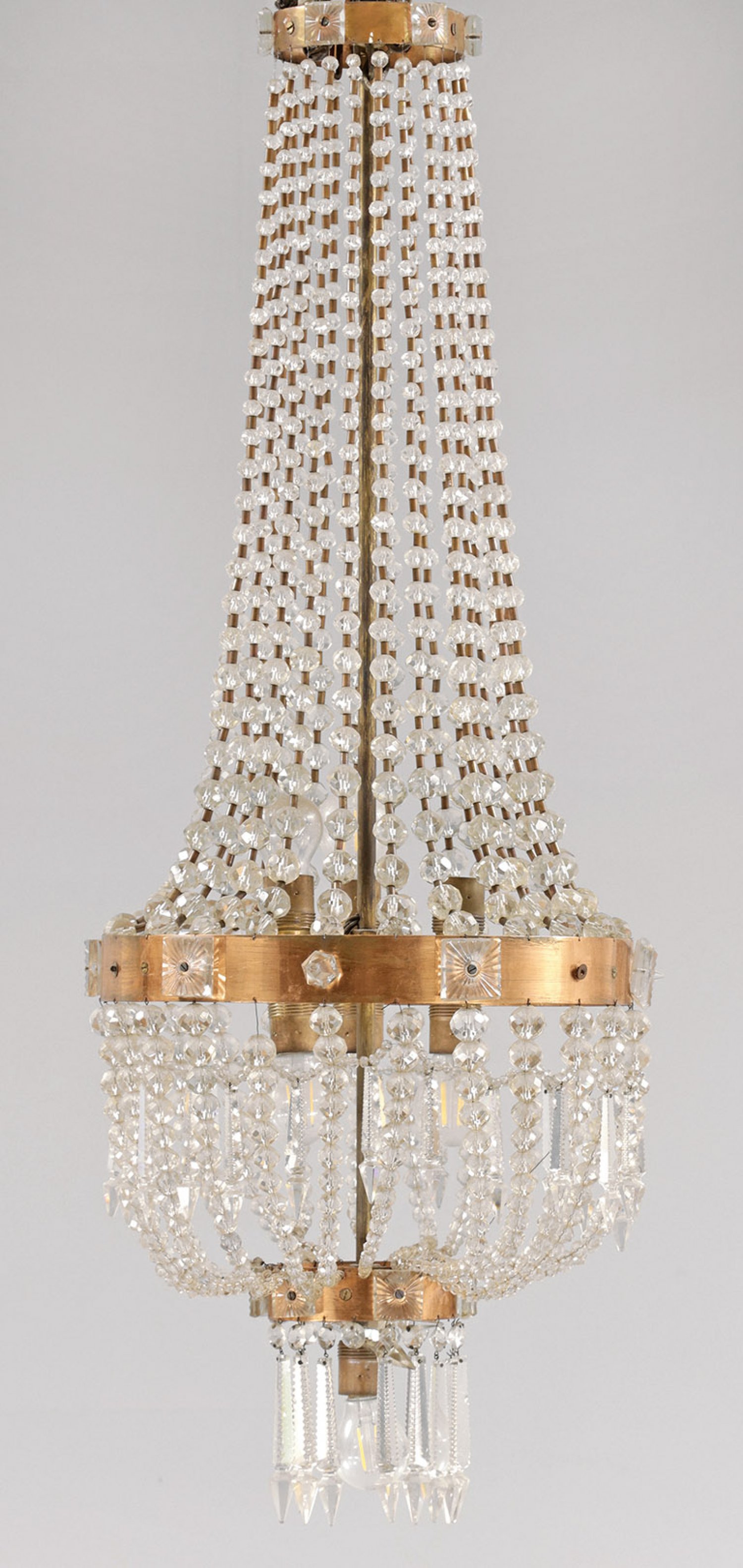 Großer Deckenlüster im Empire-Stil Kupfer, Messing und farbloses Glas. Balusterförmiger Korpus aus Prismenschnüren im Verlauf. Unterer Abschluss aus großen, facettierten Prismenstäben. Innen sieben Lampenfassungen. Elektrifiziert. Besch.; H. 110 cm. D. 41 cm.