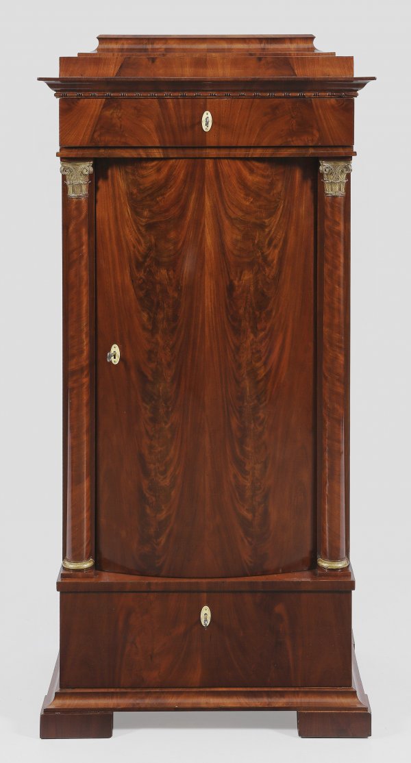 Biedermeier-Pfeilerschrank Mahagoni furniert. Gerader hochrechteckiger Korpus auf einschübigem Zargensockel schmaler Profilzarge und gekanteten Füßen. In der gegliederten Front bombierte Tür flankiert von eingestellten Halbsäulen sowie oberhalb podestförmiger einschübiger oberer Abschluss. H. 152 cm. 74 cm x 46 cm.