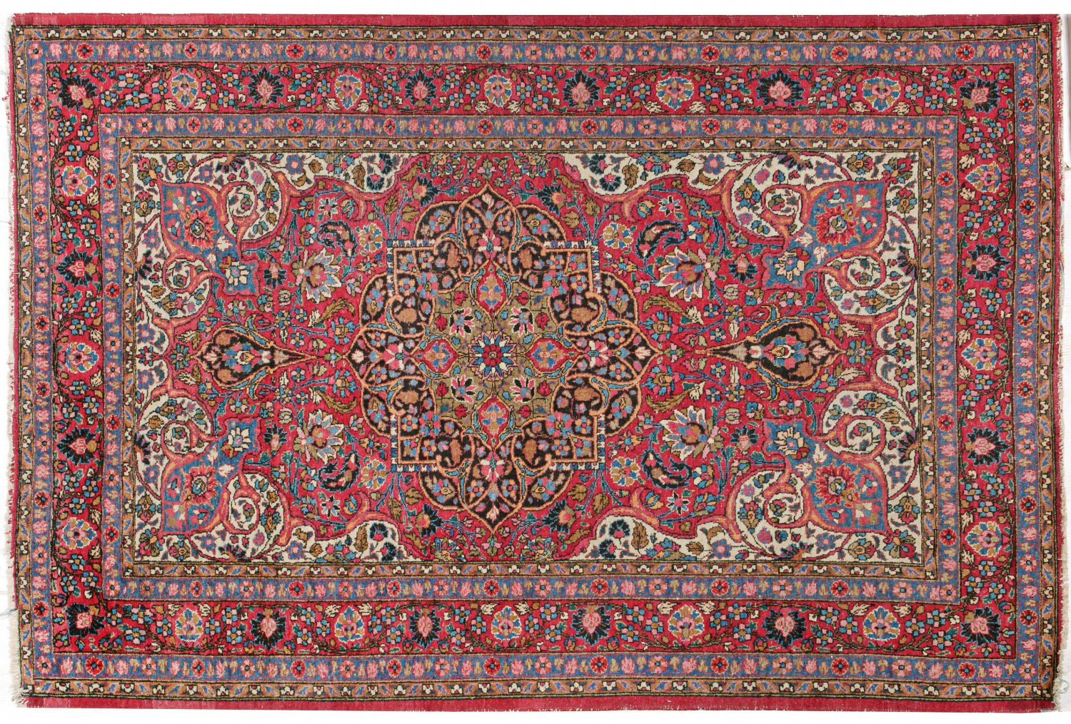 Mesched-Brücke Persien. Wolle auf Baumwolle. Im roten Innenfeld großes dunkelgrundiges Rundmedaillon mit Anhängern sowie breite elfenbeinfarbene Ecklösungen. Flächendeckend dichte Musterung aus Blütenranken. Umlaufend korrespondierende Bordüre mit Palmetten flankiert von schmalen Nebenbordüren. 150 cm x 225 cm.