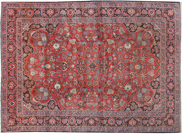 Übergroßer Keschan-Teppich Persien. Mitte 20. Jh.; Wolle auf Baumwolle. Im roten Innenfeld passig geschweifte, dunkelgrundige Ecklösungen sowie flächendeckende Musterung aus üppigen Blütenranken. Umlaufend breite Palmettenbordüre, flankiert von schmalen Nebenbordüren. 433 cm x 325 cm.