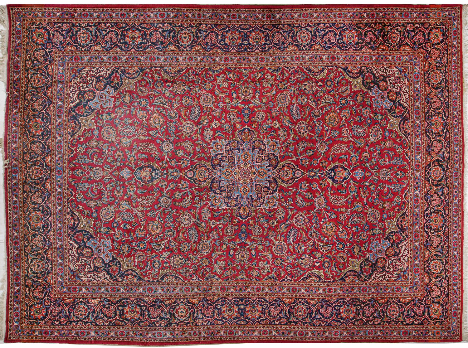 Großer Keschan-Teppich Persien. Wolle auf Baumwolle. Im roten Innenfeld blaues Zentralmedaillon mit Anhängern sowie korrespondierende Ecklösungen. Flächendeckend dichte Musterung aus üppigen Blütenranken sowie umlaufend breite dunkelgrundige Palmettenbordüre. 280 cm x 430 cm.