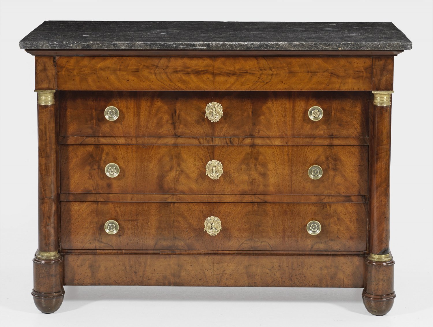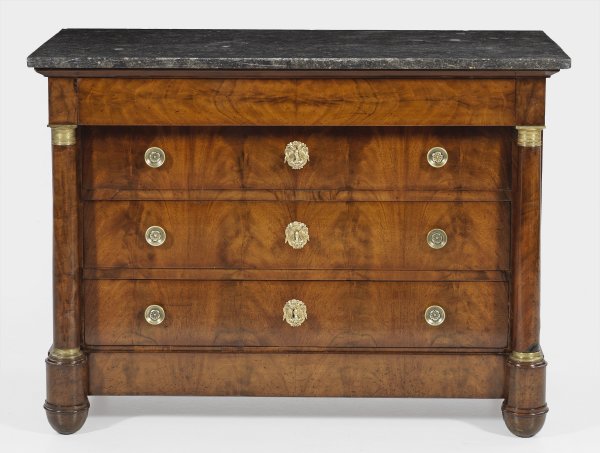 Große Empire-Kommode Mahagoni furniert. Gerader querrechteckig angelegter Korpus flankiert von eingestellten Vollsäulen mit reliefierten Basen und Kapitellen auf gerundeten Füßen. In der gegliederten Front vier breite Schubladen unterschiedlicher Größe. Deckplatte aus anthrazitfarbenem Marmor. H. 88 cm. 124 cm x 62 cm.