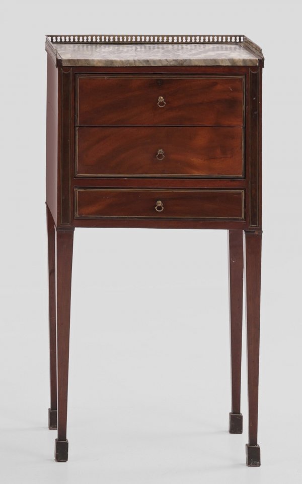 Louis XVI-Schränkchen Mahagoni, teilw. mit feinen Fadeneinlagen aus Messing. Gerader, rechteckiger Korpus auf konischen Vierkantbeinen. In der gegliederten Front drei teilw. optisch verbundene Schubladen unterschiedlicher Größe. Eingelassene Deckplatte aus graugemasertem Marmor mit durchbrochen gearbeiteter Galerierahmung. Teilw. Erg.; H. 78 cm. 40 cm x 27 cm.