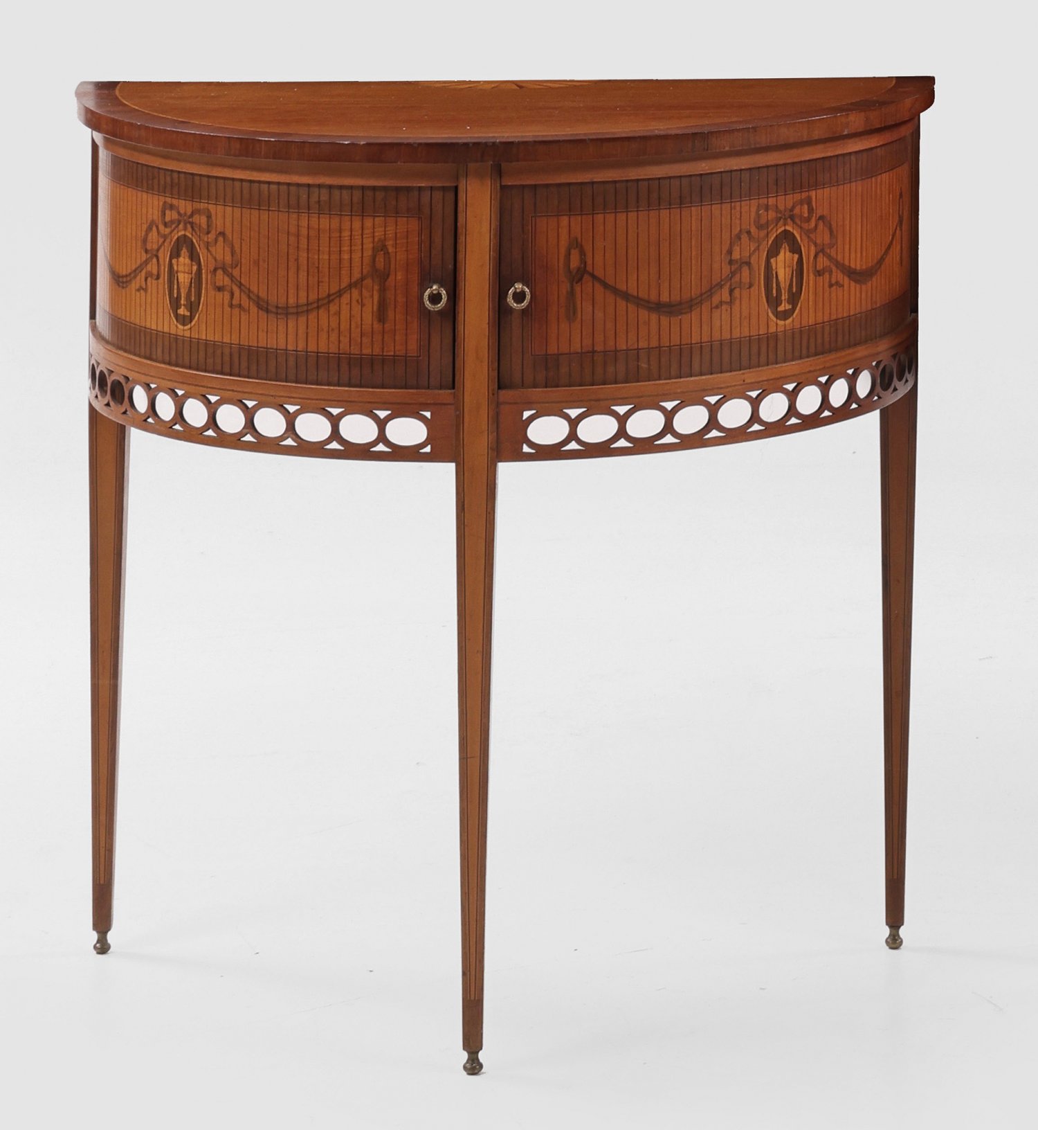 Kleine Louis XVI-Demi Lune Anrichte Satinholz und Palisander furniert. Bombierter Korpus mit durchbrochen gearbeiteter Zarge auf hohen konischen Vierkantbeinen. In der Front zweigeteilter Rolloverschluss mit gebeizten schleifenbekrönten Medaillonmotiven. Gering überstehende Deckplatte. H. 77 5 cm. 77 cm. x 40 5 cm.