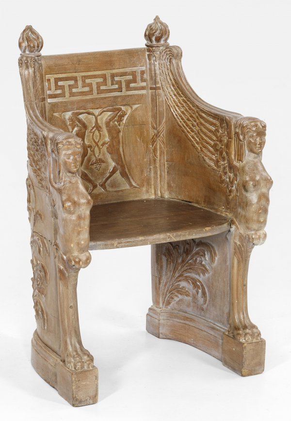 Gondelsessel im Stil des Römischen Reichs Holz teilw. geschnitzt und weiß gekalkt. Korpus aus breiten bombierten Seitenwangen mit großzügig angelegtem erhaben reliefiertem Blattwerk flankiert von vollplastisch gestalteten Genien in hohe Rückenlehnenrahmung mit Flammenbekrönung übergehend. In der Mitte Mäanderfries sowie reliefiertes gegeneinander gestelltes Satyrenpaar. Flache Sitzfläche. H. 99 cm. 64 cm x 50 cm. Sitz-H. 45 cm.