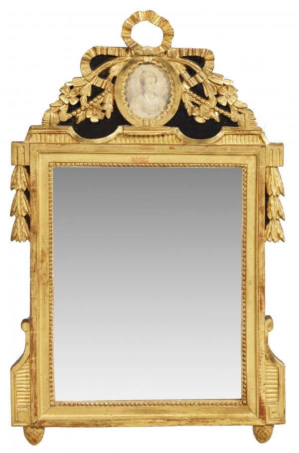 Louis XVI-Wandspiegel Holz, geschnitzt, schwarz gefasst und teilw. vergoldet. Hochrechteckige, profilierte Spiegelrahmung mit Perlstab, flankiert von gekanteten Voluten und Lorbeerblatt. Hohe Bekrönung aus zentralem Portraitmedaillon, umgeben von reliefiertem Schleifenband und Blüten. Rest.; 97 cm x 60 cm.