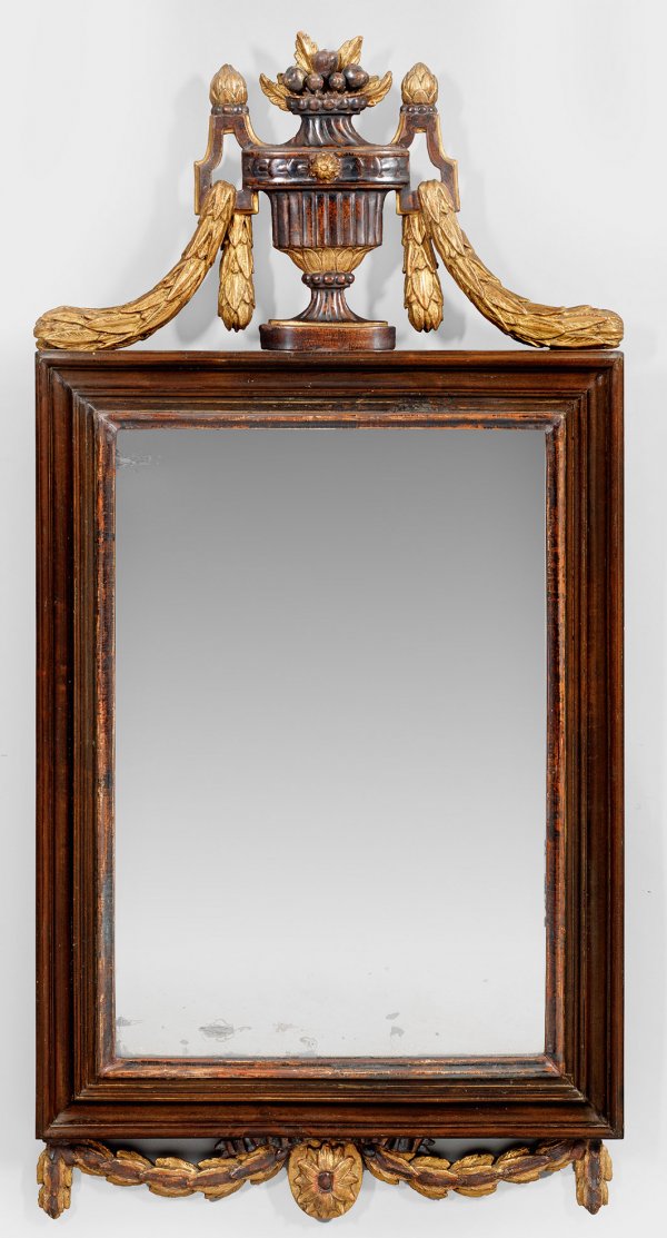Louis XVI-Wandspiegel Nussbaum sowie Holz geschnitzt gefasst und vergoldet. Hochrechteckige profilierte Spiegelrahmung mit durchbrochen gearbeiteter Bekrönung in Form einer großen Henkelvase flankiert von üppigen Lorbeerfestons. Korrespondierender unterer Abschluss. 123 cm x 60 cm.