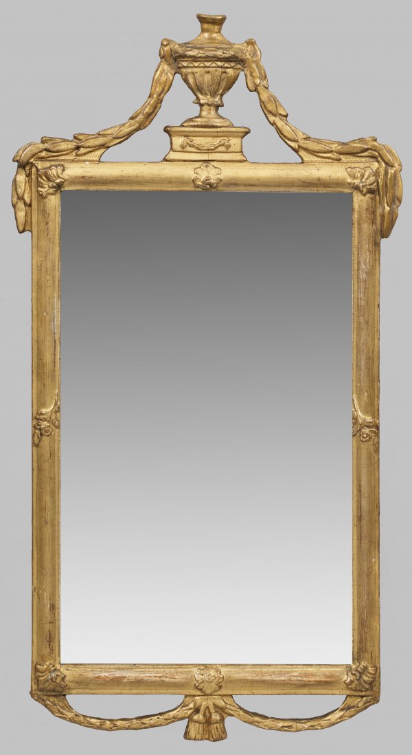 Kleiner Louis XVI-Wandspiegel Holz geschnitzt gefasst und vergoldet. Schmale hochrechteckige Spiegelrahmung mit reliefiertem Blattwerk. Oberhalb Vasenbekrönung flankiert von Festons sowie korrespondierender unterer Abschluss mit Quasten. Älteres Spiegelglas. 64 cm x 35 cm.