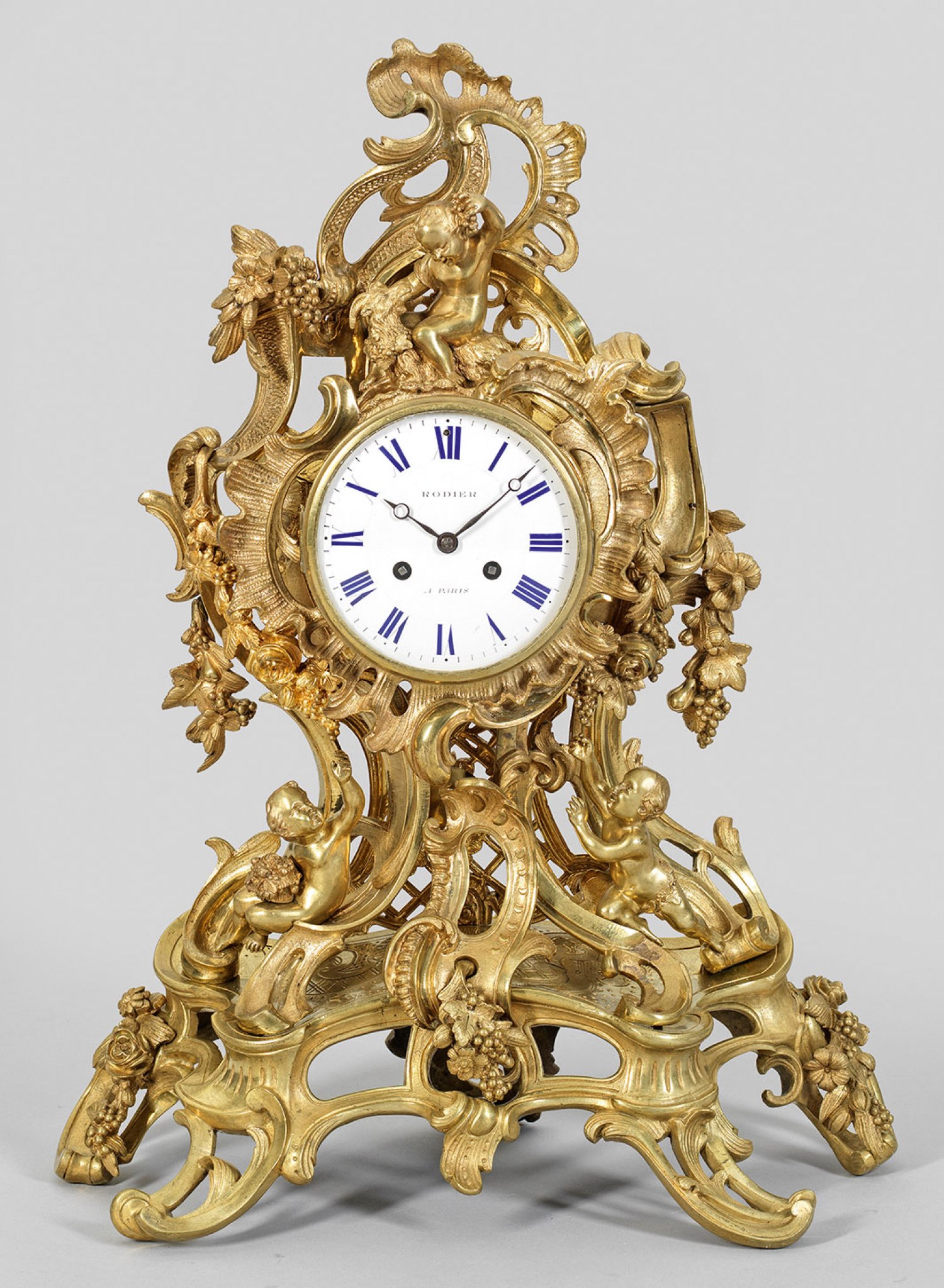 Große Rokoko-Pendule Bronze, vergoldet. Balusterförmiger, asymmetrisch gestalteter, durchbrochen gearbeiteter Korpus aus üppigen, eingerollten Volutenmotiven und Rocaillen, umgeben von Rosenfestons mit Trauben. Vollplastisch gearbeitete Puttenkinder. Verglastes Emailzifferblatt, bez. Rodier ŕ Paris. Pendulenwerk mit Fadenaufhängung sowie Halbstundenschlag auf Glocke. Platine bez. Rodier ŕ Paris sowie Pons. Unw. besch.; H. 59 cm. 47 cm x 24 cm.