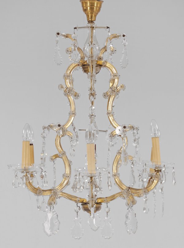 Großer Maria Theresia-Deckenlüster 6-flg.; Farbloses Glas und goldfarbenes Metall. Offen gestalteter, balusterförmiger Korpus aus stark geschwungenen Streben als Träger für zylinderförmige Tüllen über großen Traufschalen. Oberhalb kurzer Balusterabschluss sowie reicher Behang aus facettierten Prismen. Elektrifiziert. Unvollständig. H. 90 cm. D. 70 cm.