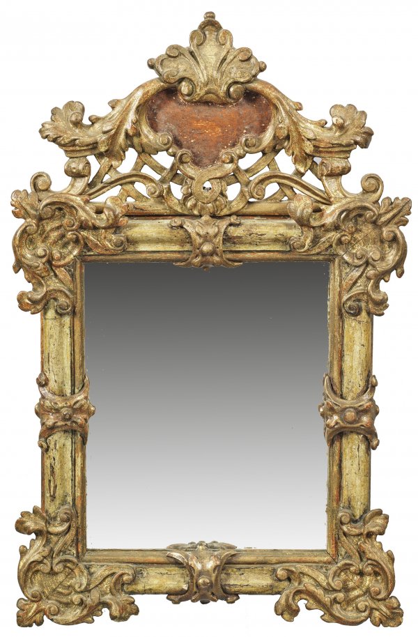 Barock-Wandspiegel Holz geschnitzt. cremefarben und siegelrot gefasst sowie teilw. vergoldet. Hochrechteckige profilierte Spiegelrahmung mit üppigen Blattvoluten und Volutenspangen. Durchbrochen gearbeitete Bekrönung mit zentraler Kartusche Gitter- und Blattwerk. 66 cm x 42 cm.