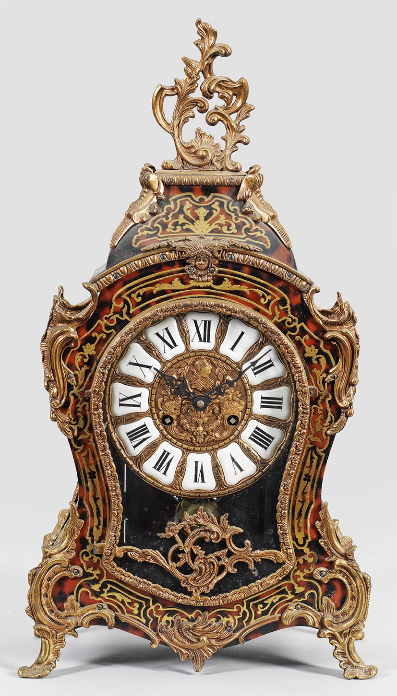 Dekorative Pendule im Boulle-Stil Flächendeckender Fond in Schildpattoptik Einlagen aus Messing sowie patinierte Bronze. Balusterförmiger Korpus umgeben von üppigen Rocaillen. Zifferblatt mit Emailreserven. Halbstundenschlag auf zwei Glocken. Herstellerzeichen. H. 57 cm.