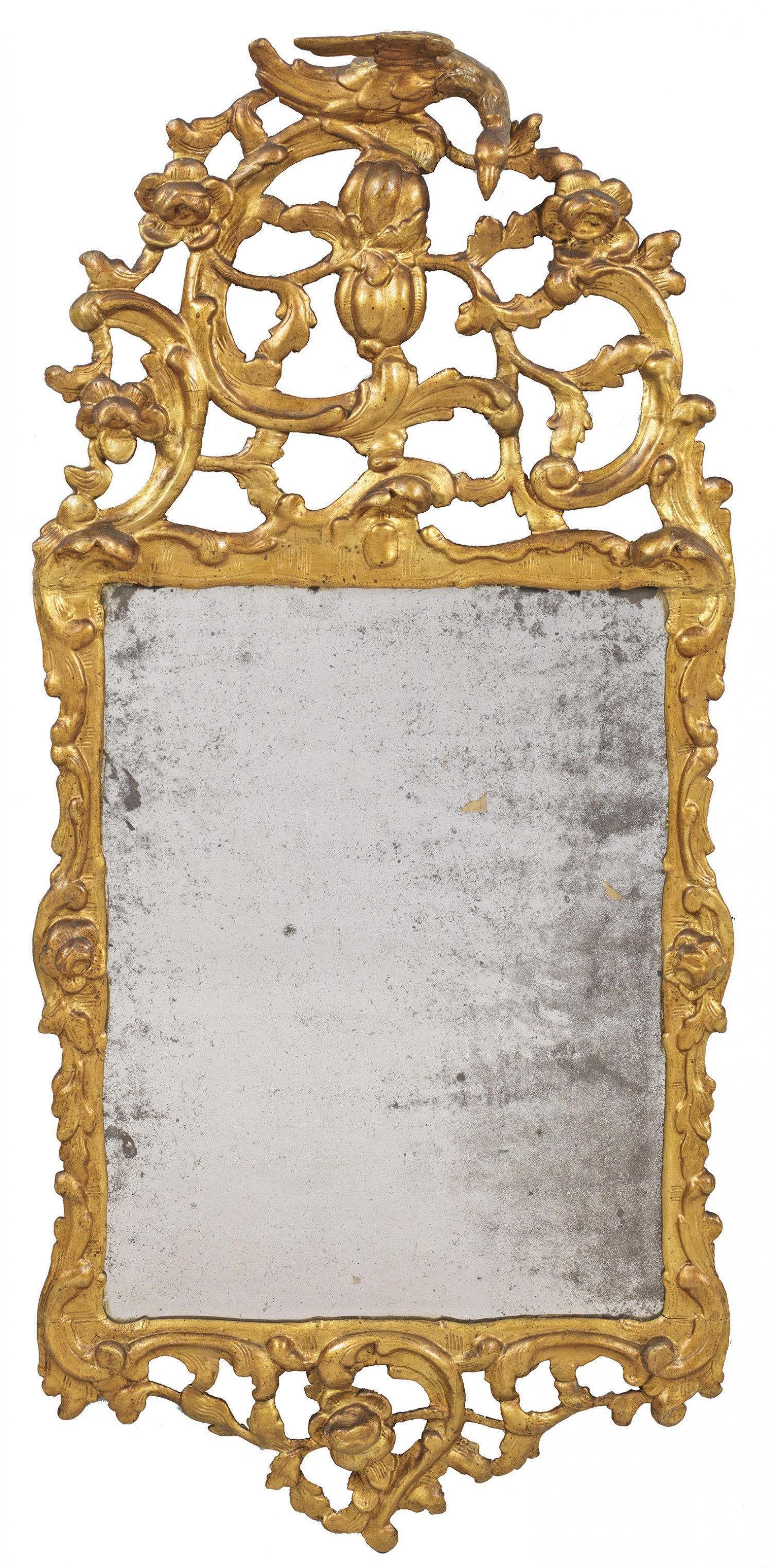 Großer Barock-Wandspiegel Holz geschnitzt gefasst und vergoldet. Hochrechteckige Spiegelrahmung aus erhaben reliefiertem Blattwerk und C-Bögen. Hoch aufgeworfene durchbrochen gearbeitete Bekrönung aus üppigen Voluten Blüten und plastisch gestaltetem Phönix. Korrespondierender unterer Abschluss. 143 cm x 66 cm.