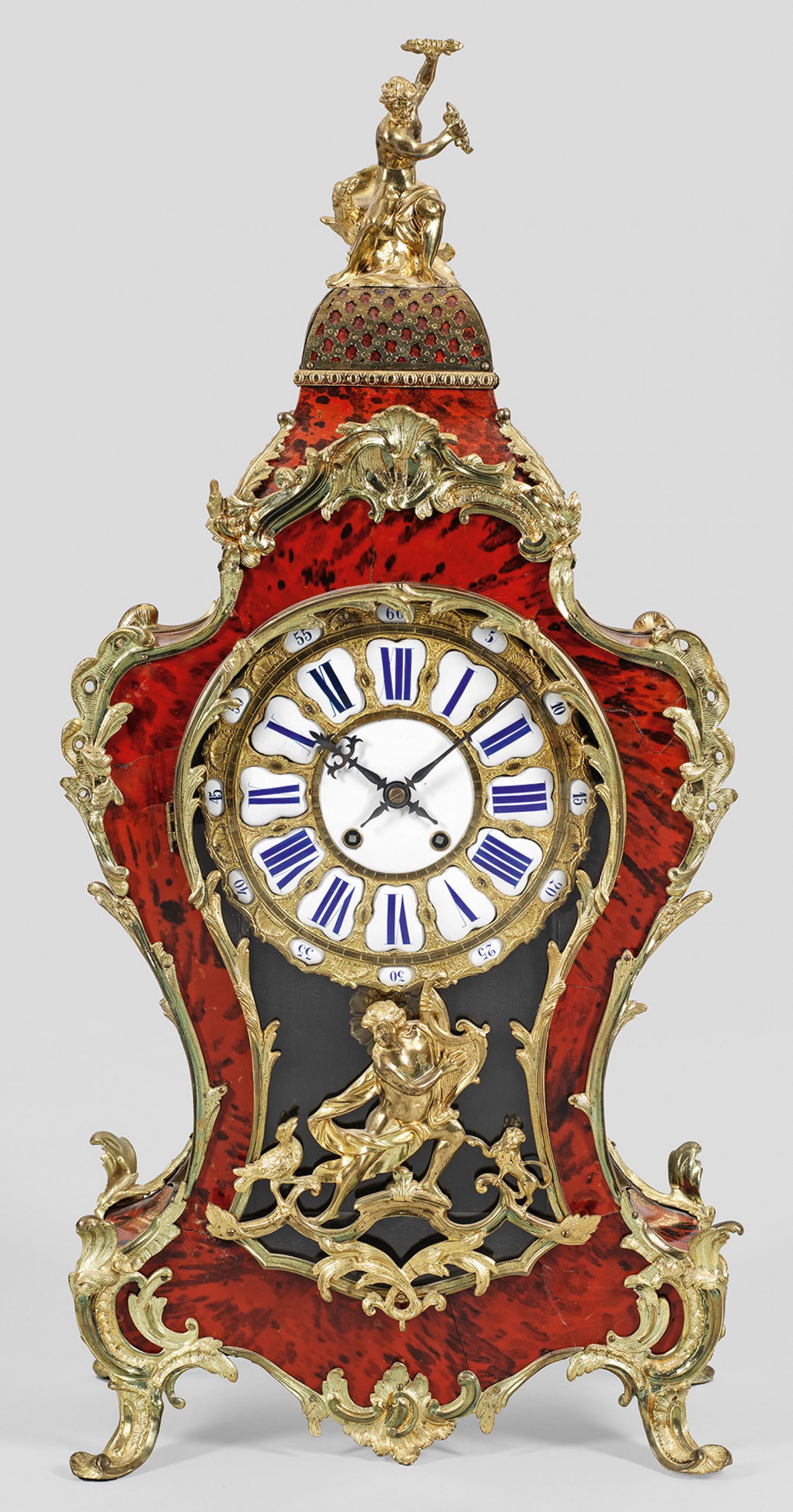 Große Louis XV-Pendule Flächendeckender Fond aus rot hinterlegtem Horn sowie Applikationen aus vergoldeter Bronze. Balusterförmiger, dreiseitig verglaster Korpus mit geschweift ansteigendem oberen Abschluss sowie figuraler Bekrönung. Reliefiertes Zifferblatt aus großen Emailreserven. Werk mit Pendelfeder sowie Viertelstundenschlag auf Tonfeder. Platine bez. "Lenzkirch". H. 89 cm. 42 cm x 21 cm.