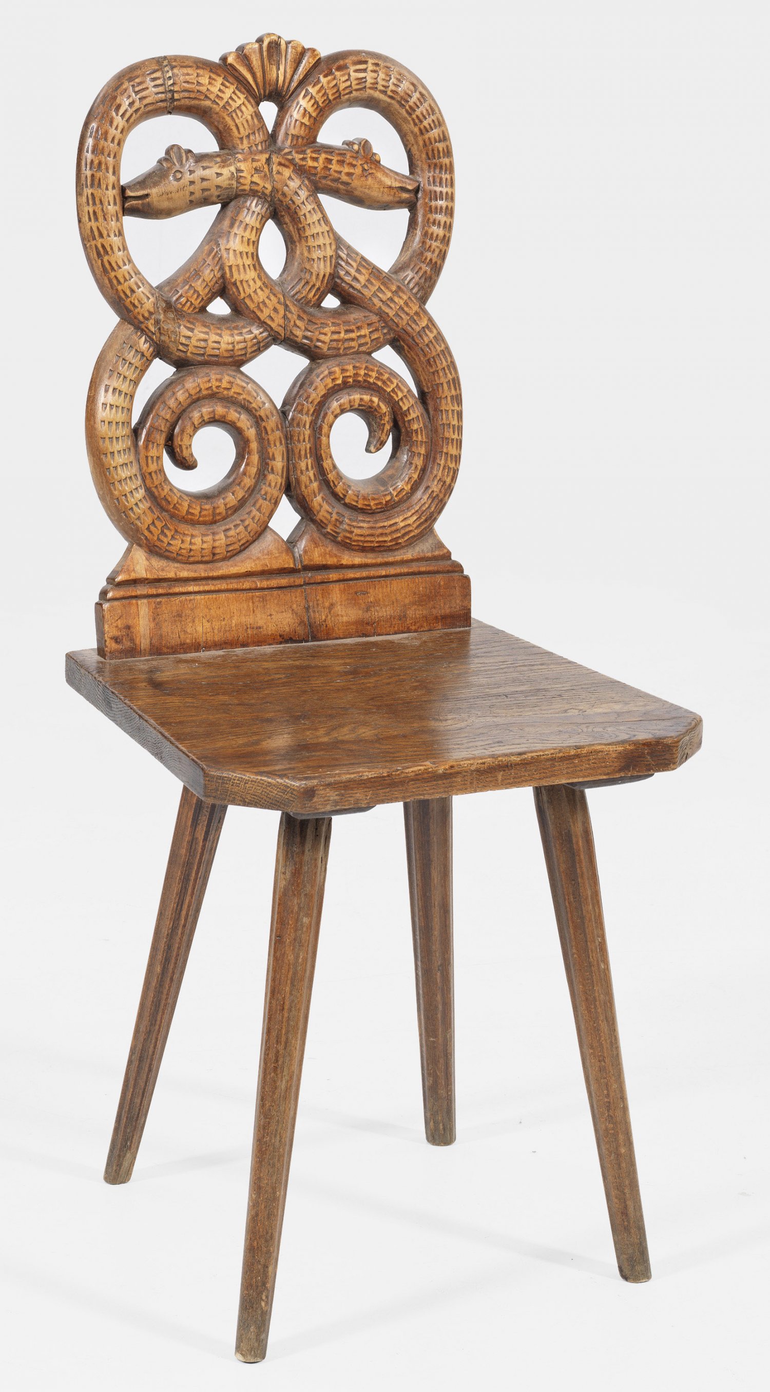 Seltener barocker Schlangen-Brettstuhl Nussbaum und Eichenholz teilw. geschnitzt. Rechteckige abgekantete Sitzfläche auf schräggestellten kannelierten Beinen. Durchbrochen gearbeitete Rückenlehne aus zwei ineinander verschlungenen Schlangen. Sitz-H. 43 5 cm.