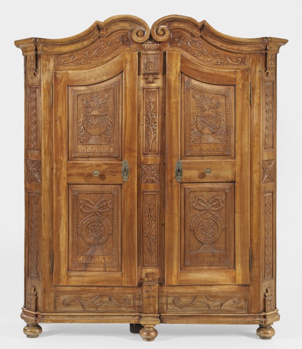 Klassizistischer Dielenschrank Kirschbaum teilw. geschnitzt. Gerader hochrechteckiger zweigeteilter Korpus flankiert von breiten schräggestellten Ecklisenen mit reliefiertem Wellenbandfries und Blattwerk. In der gegliederten Front zwei kassettierte Türen mit erhaben reliefierten Vasenmotiven und schleifenbekrönten Reserven. Umlaufend tief gekehltes mittig hoch aufgeworfenes Kranzgesims aus gegeneinandergestellten eingerollten Voluten. Dat. 1835 sowie Monogramm AG. H. 210 cm. 184 cm x 56 cm.