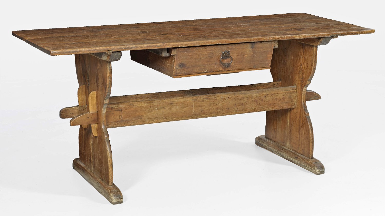 Großer Wirtschaftstisch Fichtenholz. Flache balusterförmige Seitenwangen auf schmalen Kufen dazwischen durch breite Stege verbunden. Rechteckige Deckplatte sowie unterhalb großes Schubfach. H. 79 cm. 183 cm x 79 cm.