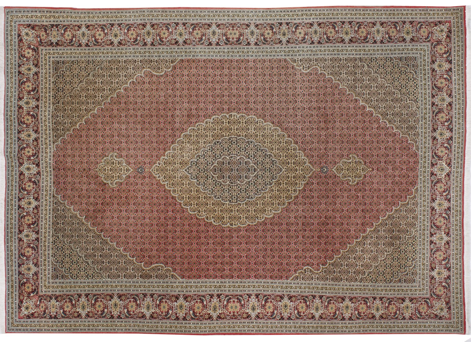 Täbris-Teppich Persien. Wolle mit Seide auf Baumwolle. Feine Knüpfung. Im rautenförmigen hellroten Innenfeld großes beigefarbenes Ovalmedaillon mit Anhängern und korrespondierende Ecklösungen. Flächendeckend dichte sog. Fischmusterung. Umlaufende Hauptbordüre mit Arabesken. 205 cm x 285 cm.