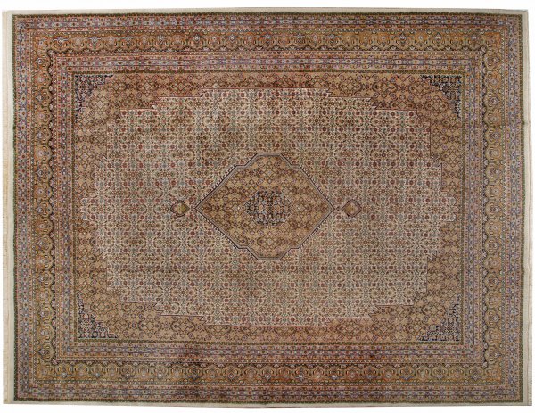 Großer Teppich mit Täbris-Muster Wolle auf Baumwolle. Im hellen Innenfeld rautenförmiges Zentralmedaillon mit kleinen Anhängern sowie korrespondierende Ecklösungen in Beige. Umlaufend vielteilige Ornamentbordüre. 404 cm x 304 cm.