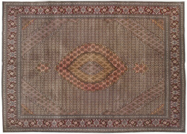 Großer Täbris-Teppich Persien. Wolle auf Baumwolle. Im Innenfeld großes gestrecktes Ovalmedaillon mit Anhängern sowie breite Ecklösungen. Flächendeckend dicht angelegte Rapport-Musterung. Umlaufend rotgrundige Palmettenbordüre flankiert von schmalen Bändern. 345 cm x 251 cm.