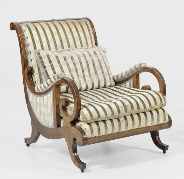 Großer Sessel im Regency-Stil Mahagoni. Geschwungene durchbrochen gearbeitete Seitenwangen aus ausgebogten Beinen. Schmale volutenförmige Armlehnen sowie weit zurückschwingende Rückenlehnenrahmung. Allseitig gepolstert und bezogen. H. 95 cm. 79 cm x 103 cm. Sitz-H. 40 cm.