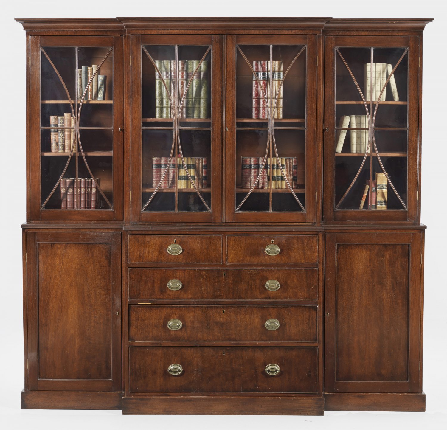 Regency-Bookcase Mahagoni furniert. Gerader querrechteckig angelegter Korpus auf schmalem Zargensockel. In der gegliederten Front vorkragendes fünfschübiges Mittelteil flankiert von zwei Türen. Oberhalb korrespondierender viertürig sprossenverglaster Vitrinenaufsatz. Umlaufend schmales Profilgesims. H. 211 cm. 228 cm x 61 cm.